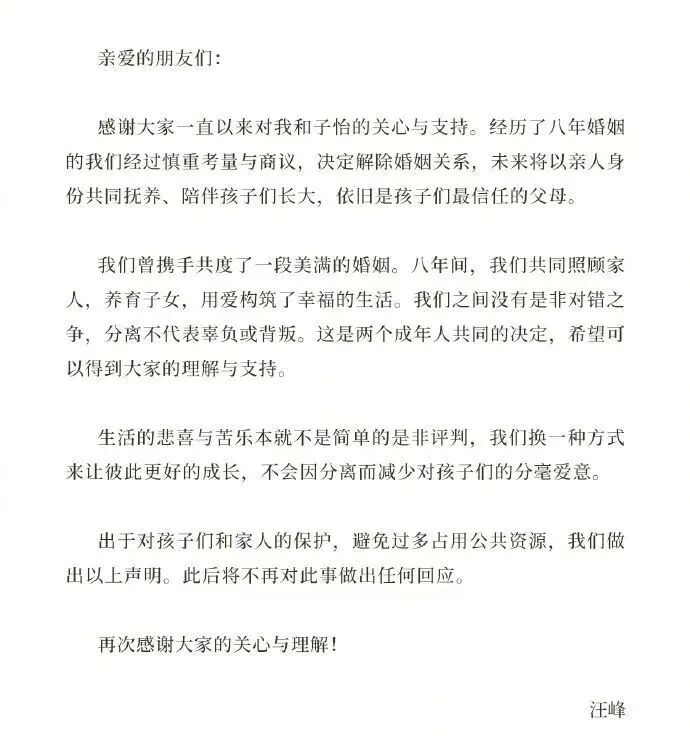 毕竟,在离婚声明里,两人没有后悔与怨恨,甚至用“美满”二字形容这段已经结束的婚姻。