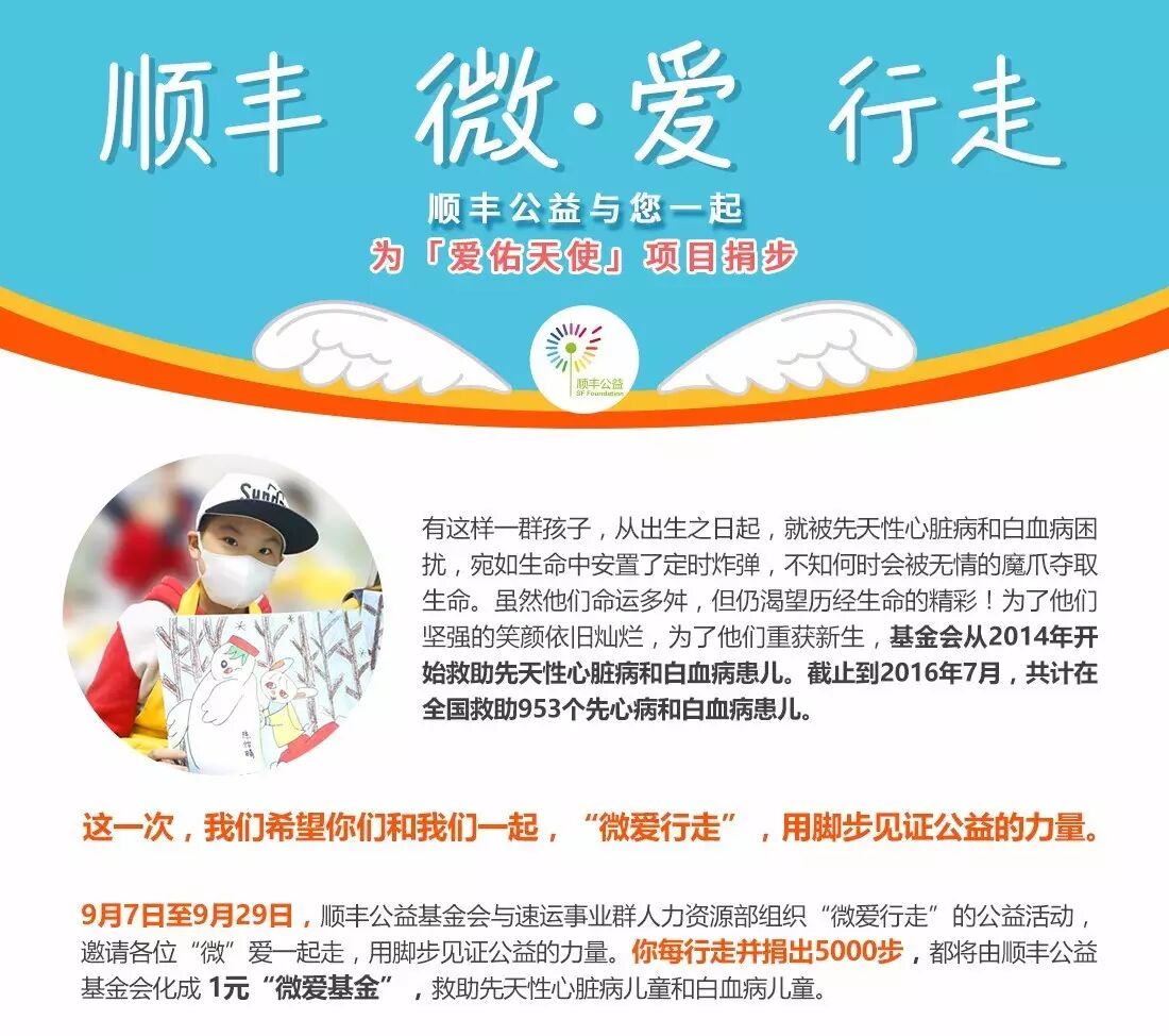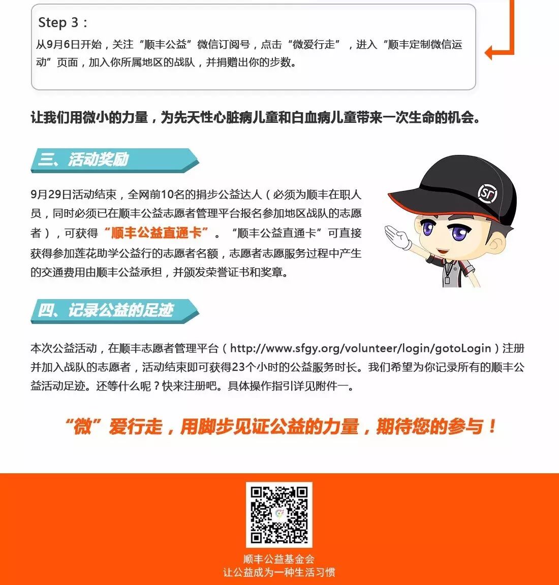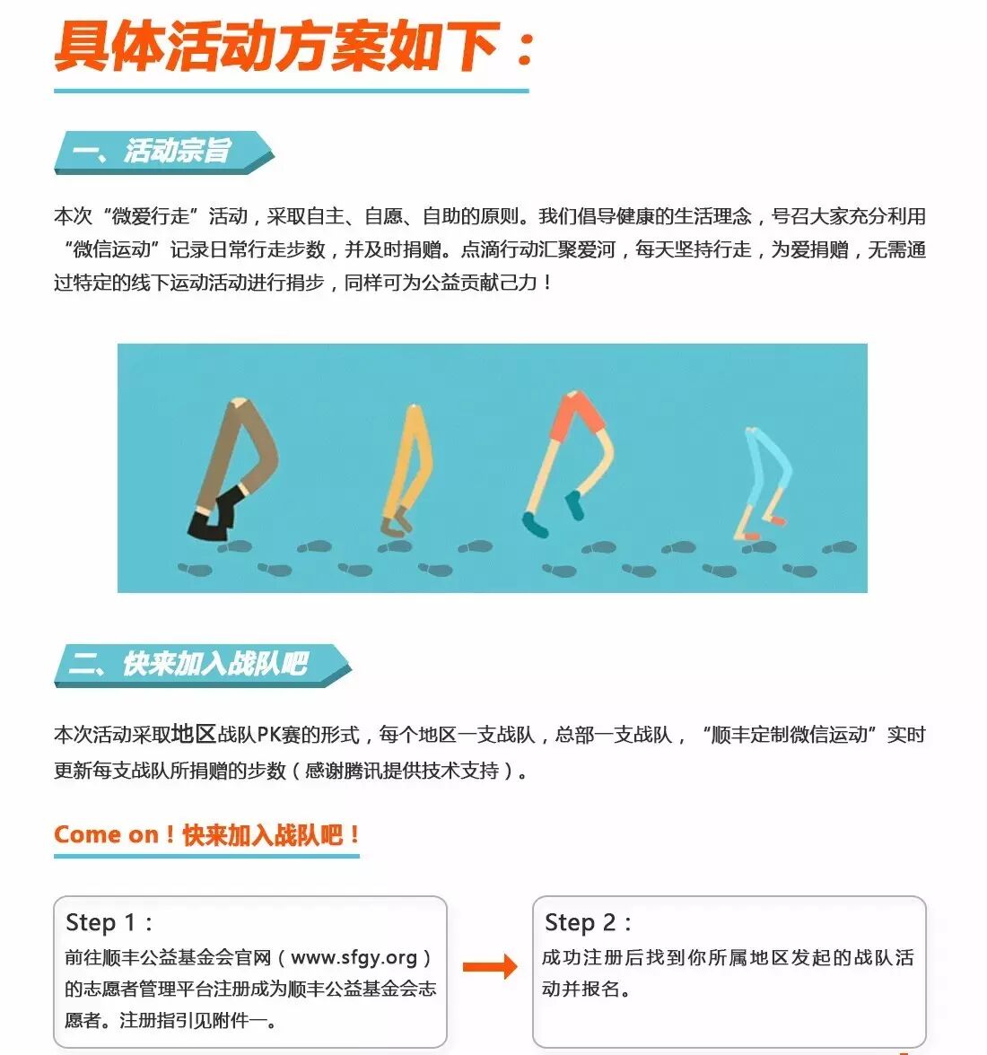 时隔半年,我们又来了。这一次,参与腾讯99公益日,和吴秀波一起捐步,一起爱。9月6日当天,如果您参与微信运动捐步,您每捐赠一万步,顺丰公益基金会将捐赠1元公益基金用于救助白血病患儿哦。快来一起参加吧,金服BG总部同事可加入“顺丰微爱行走-总部爱心队”;金服分公司同事可加入分公司当地的小分队,更详细的参与步骤请查阅下方图片: