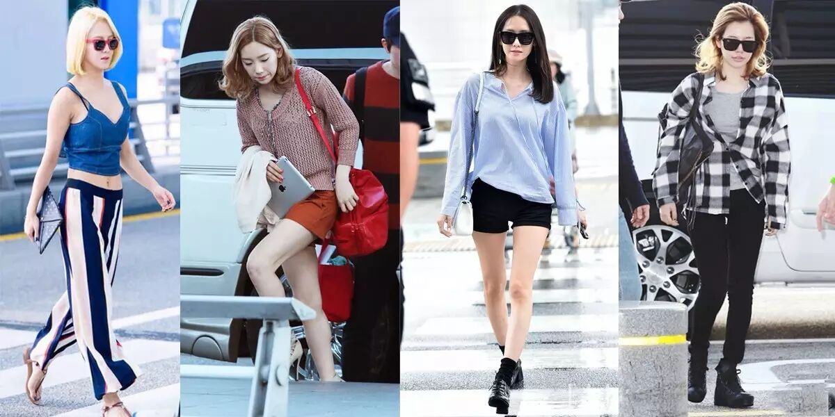 少时成员特别会利用长短搭配控制整体视觉,孝渊的露脐短衣+阔腿修身长裤,泰妍和允儿喜欢用长袖休闲T或针织衫+短裤达到遮臂显腿效果,都可以作为日常穿衣法则干货。