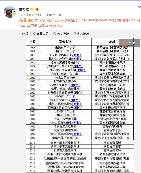 尔冬升在微博上贴出一张名单,名单上记录了古天乐从2009年以来在广西、贵州、云南等地出资千万建造的60多所小学。
