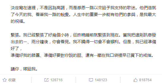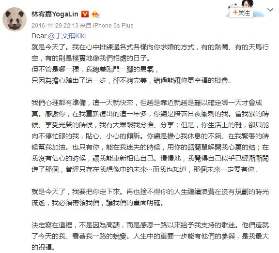 之后的16年11月29日,林宥嘉在微博上面发了好长的一段文字向丁文琪求婚!哈哈哈,插句题外话,微博求婚这个操作也是666哈~