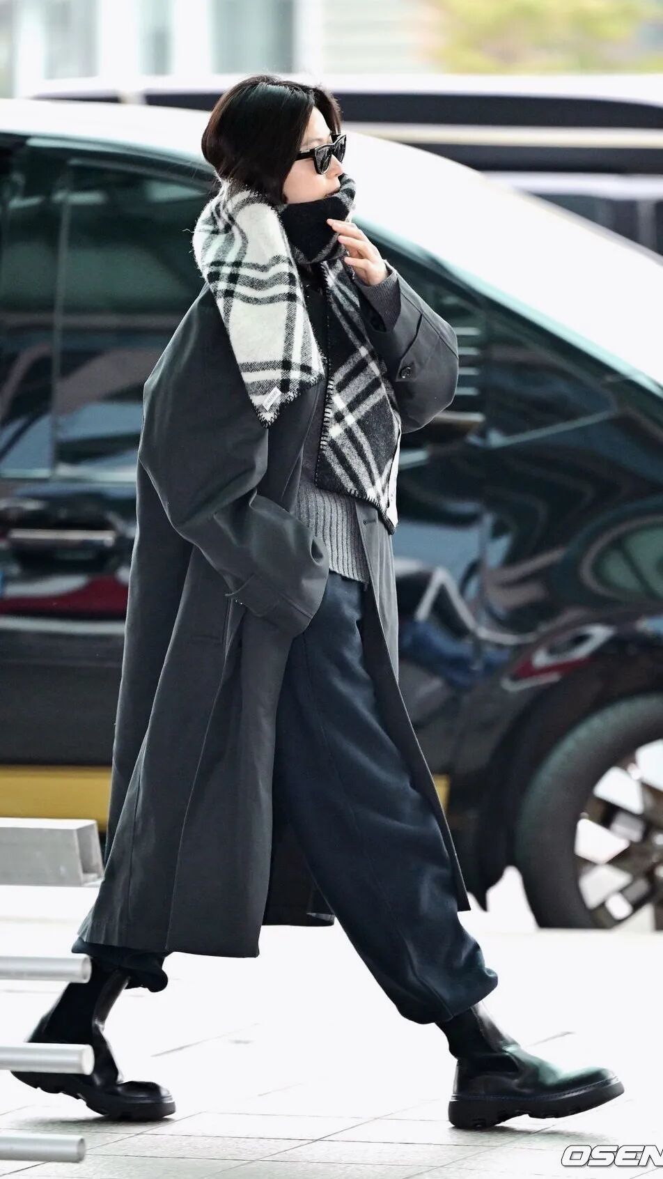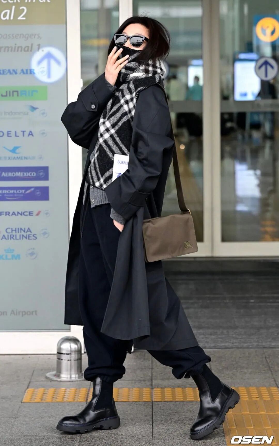 伦敦时装周出行机场,一身经典款式的黑色大衣搭配黑白格纹围巾,简单利落,看似低调普通的搭配,却处处透露着巨星风范。