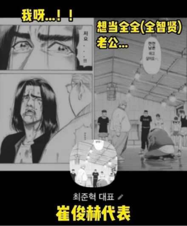早前婚变传闻时,丈夫第一时间就发布了一张《灌篮高手》的漫画截图,并把角色「教练我想打球」的台词,改成了「我呀!想当全全(全智贤)老公……」