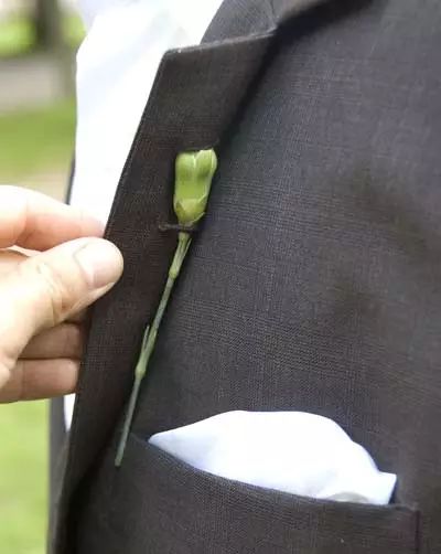 这里有一个细节值得注意。比如,如果插戴的是康乃馨的话,花萼要整个陷到扣眼里去,然后被后面的绳圈固定住。