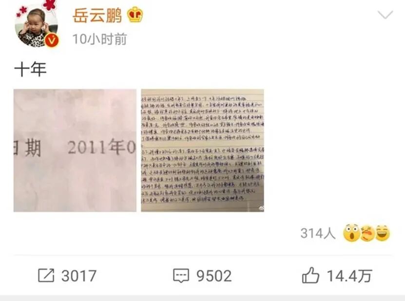 2月9日,小岳岳在微博上公开表白妻子郑敏,并附上了两人的领证日期,和一封手写的情书。