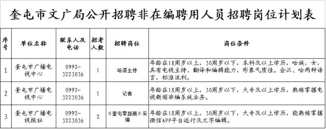 15、奎屯市文化体育广播影视局非在编聘用人员招聘4人