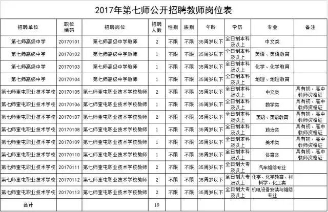 为适应七师教育事业发展的需要,第七师人力资源和社会保障局将于2017年1-2月面向社会公开招聘19名教师。