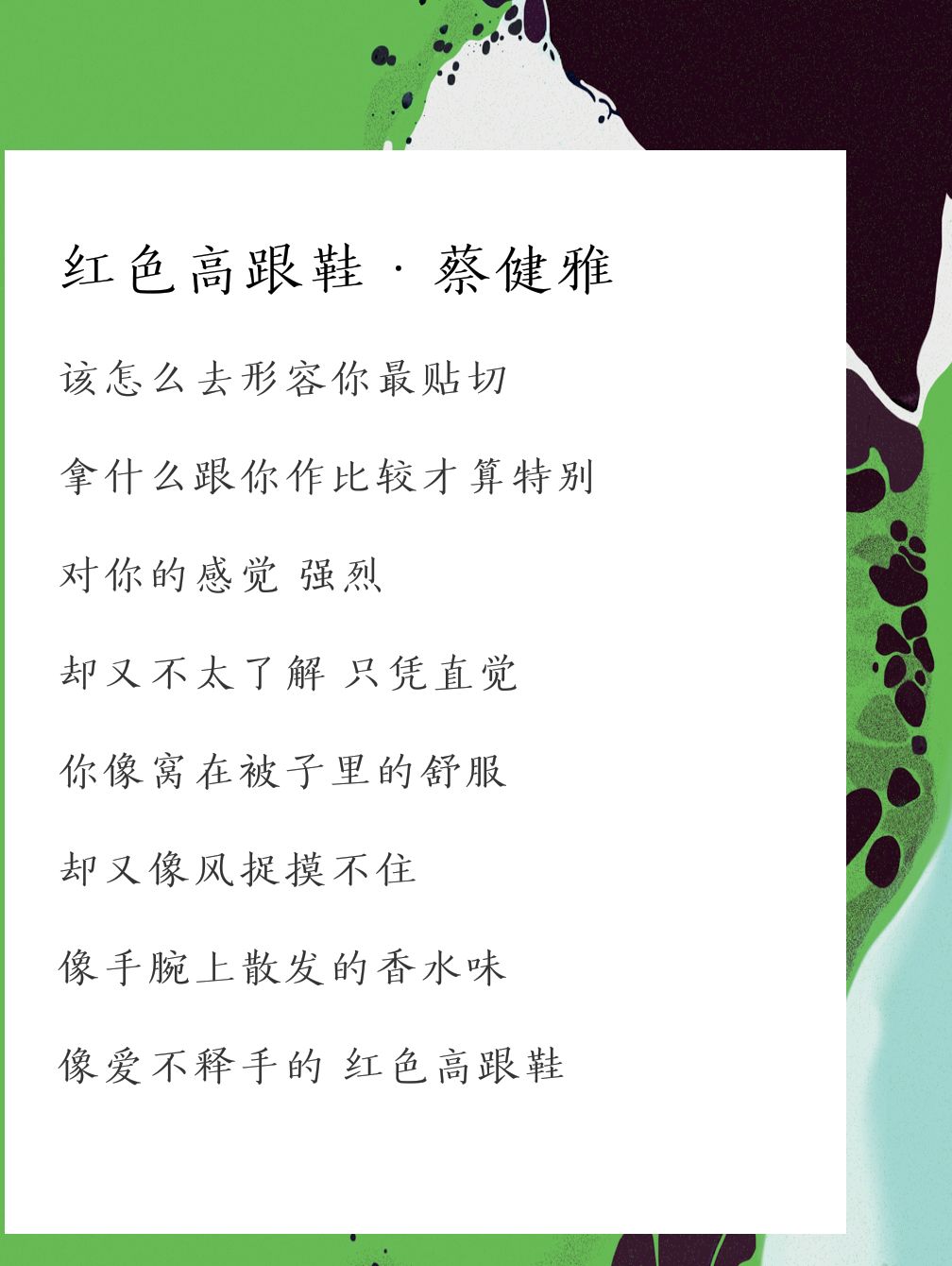 《红色高跟鞋》由蔡健雅作词、作曲,这首歌曲是2008年上映的贺岁电影《爱情呼叫转移2》的主题曲,之后收录在蔡健雅2009年8月发行的专辑《若你碰到他》中;这首歌曲对都市男女爱情观的透彻解读,令人过耳难忘。身为音乐创作人、制作人以及演唱者的蔡健雅,把整首歌的音线弧度表现得相当得舒服自在,都市女性的独立自主,知性自信也在她慵懒温暖的声线中有了最鲜活的展示。