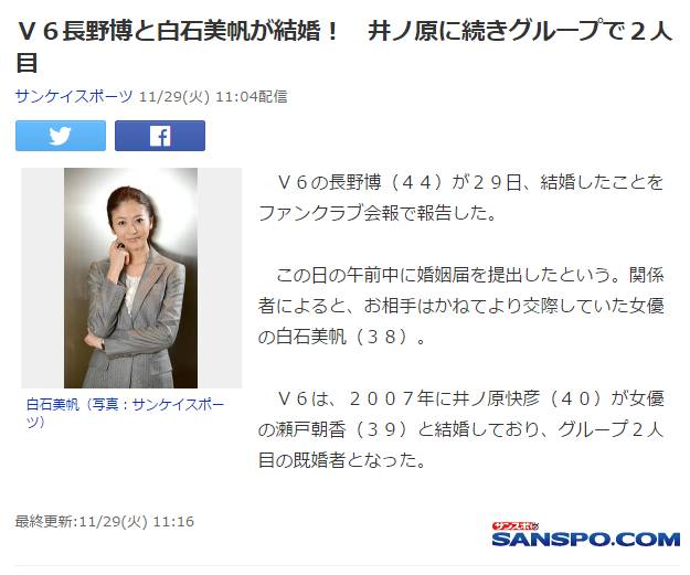 他也是继井之原快彦之后V6组合中第二个结婚的人,恭喜!