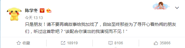 ↓↓↓29日中午,陈学冬发微博疑似回应与郭敬明的恋情:只是朋友!请不要再编故事给我加戏了,自始至终那些为了寻开心看热闹的朋友们,听过这首歌吧?“该配合你演出的我演视而不见!”