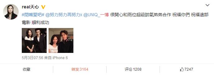 当时天心正在拍摄与张艺兴、王一博共同主演的电影《闭嘴!爱吧》,天心在戏中饰演张艺兴的经纪人。