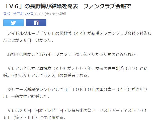 今日,V6成员长野博在FC的会报中宣布了自己结婚的消息!