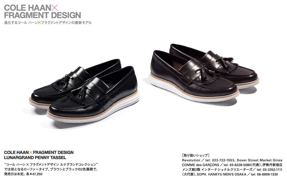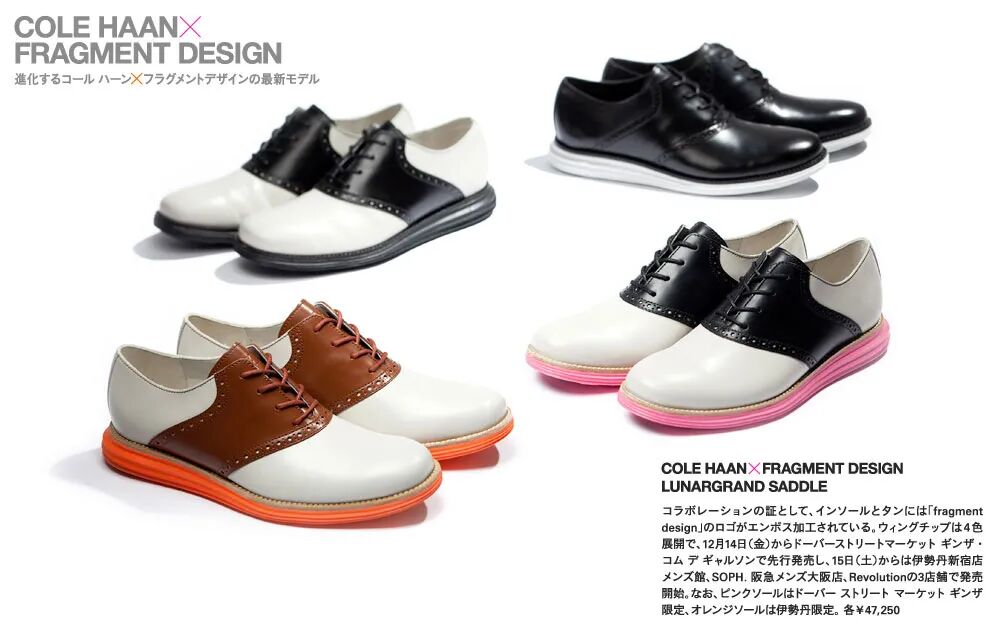 在 Cole Haan 和 Nike 的合作中,Cole Haan 和 Nike 将经典的 Air Sole 以及 Lunar 等运动鞋中底科技融入皮鞋当中,这也是 Nike 在皮鞋领域的首次尝试,而到了 2012 年 Nike 的皮鞋人气可谓来到了顶峰,因为他们找来了藤原浩的 fragment design 合作。