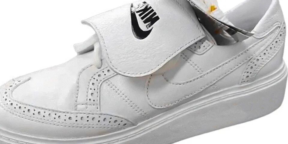 可以看到这双鞋采用了纯白色的设计,超大的外翻式鞋舌印着双方 Logo ,而最大的特点无疑就是鞋头处的 Wing-Tip 以及雕花设计,这种设计更多地会出现在皮鞋上,Nike 的鞋款中确实颇为少见的。
