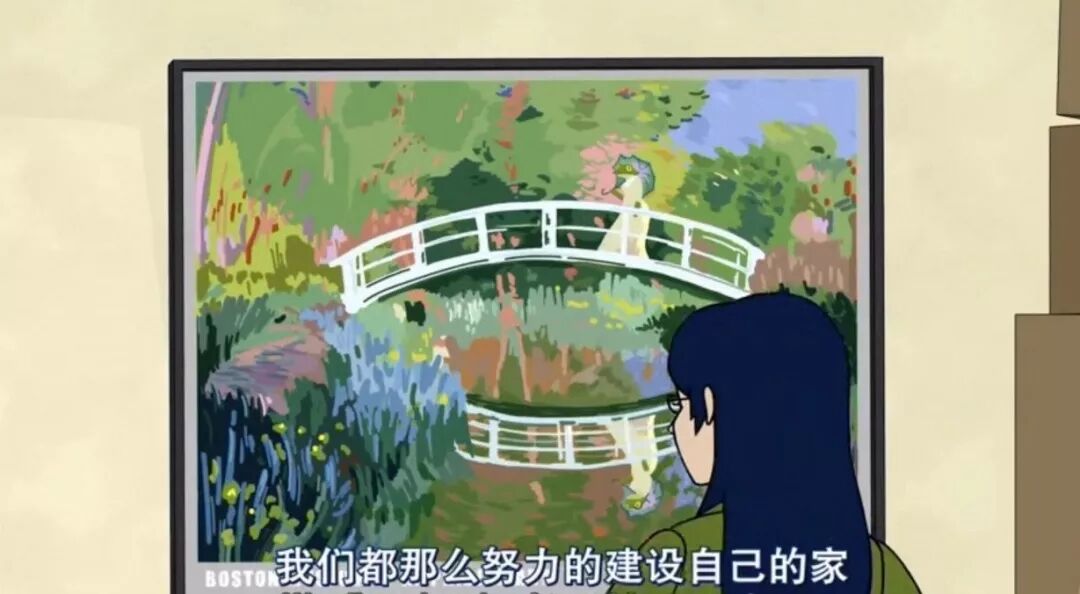 《马男波杰克》第五季在上周回归了,在那些看似丧得要命的都市人类背后,总是挂着好看的装饰画。从波杰克办公室挂的那幅大卫•霍克尼的游泳池系列,到戴安新家中那幅莫奈的《花园》,似乎都在做着人生最后的发声——“即使内心暂时崩塌了,我们的外壳和品味还在。”