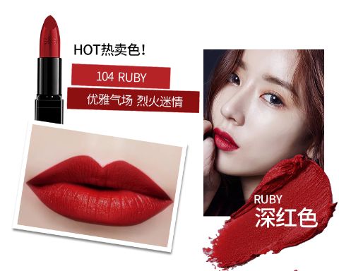 #104:RUBY深红,黄皮星人必备,优雅气场必备,轻轻一抹超级显白,也是一款适合秋冬入坑的口红。润泽度非常高,唇纹深的宝宝,死皮星人完全不用担心显露唇纹,死皮变多。