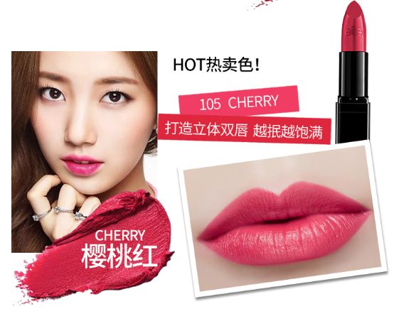 #105:樱桃红,很温柔的水果红,不仅显色,而且能让双唇显得水嘟嘟。就算嘴唇再干,涂上都能把死皮和唇纹压下去,因为里面的透明质酸(玻尿酸)含量非常高。