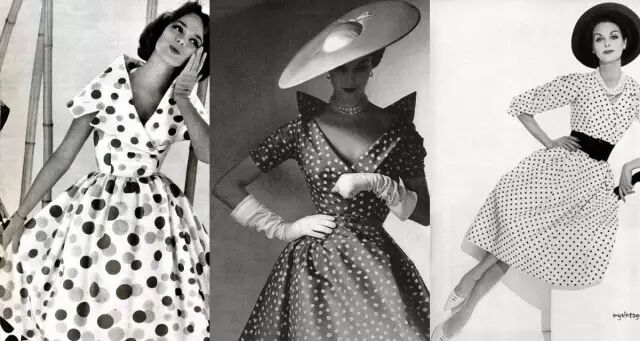 波尔卡圆点:同一大小、同一种颜色的圆点以一定的距离均匀地排列而成的图案。在上世纪50年代,以黑底白点作为配色的波尔卡图案是她们的首选,并且风靡了当时的电影电视圈。