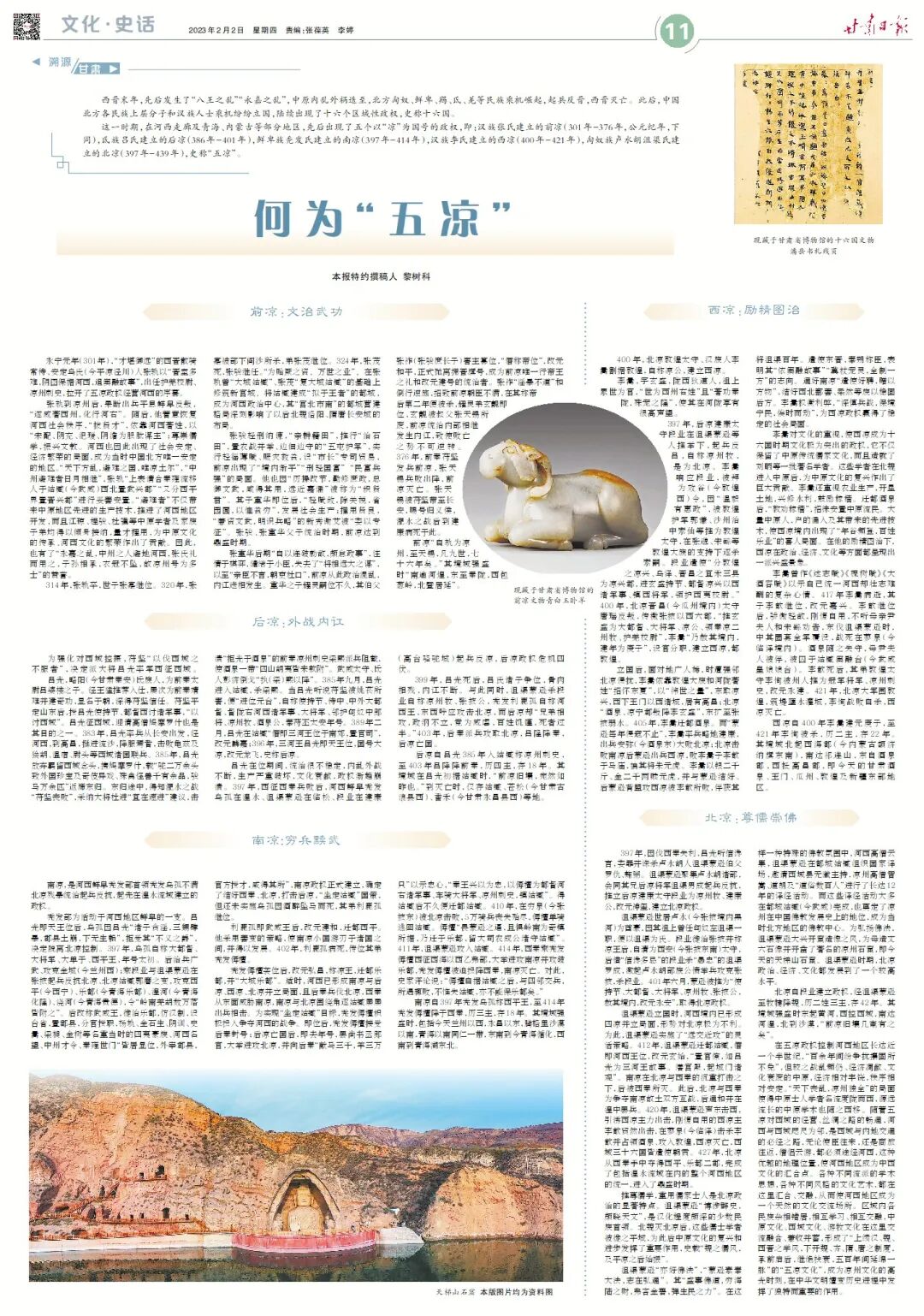 在五凉政权控制河西地区长达近一个半世纪,“百余年间纷争扰攘固所不免”,但较之战乱频仍、经济凋敝、文化衰废的中原,经济相对丰饶,秩序相对安定。“天下丧乱,凉州独全”的局面使得中原士人学者名流度陇而西,源远流长的中原学术也随之西移。随着五凉对西域的经营、丝绸之路的畅通,河西与西域咫尺为邻,是西域与内地交通的必经之路,无论使臣往来,还是商旅往返,僧侣云游,都必须途经河西,这种优越的地理位置,使河西地区成为中西文化的汇合点。各种不同流派的学术思想,各种不同风格的文化艺术,都在这里汇合、交融,从而使河西地区成为一个天然的文化交流场所。区域内各民族杂相错居,相互学习、相互交融,中原文化、西域文化、游牧文化在这里交流融合、兼收并蓄,形成了“上续汉、魏、西晋之学风,下开魏、齐、隋、唐之制度,承前启后,继绝扶衰,五百年间延绵一脉”的“五凉文化”,成为凉州文化的高光时刻,在中华文明嬗变历史进程中发挥了独特而重要的作用。