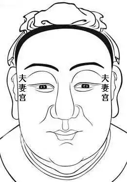 夫妻宫位于眼尾部位,又称奸门,关系夫妻关系的吉凶,如果夫妻宫低陷肉薄,则婚姻生活易张傲、不易协调;如果夫妻宫有十字纹,则可能对老婆很凶,又家暴倾向;如果见黑痣,则有会克妻等等。