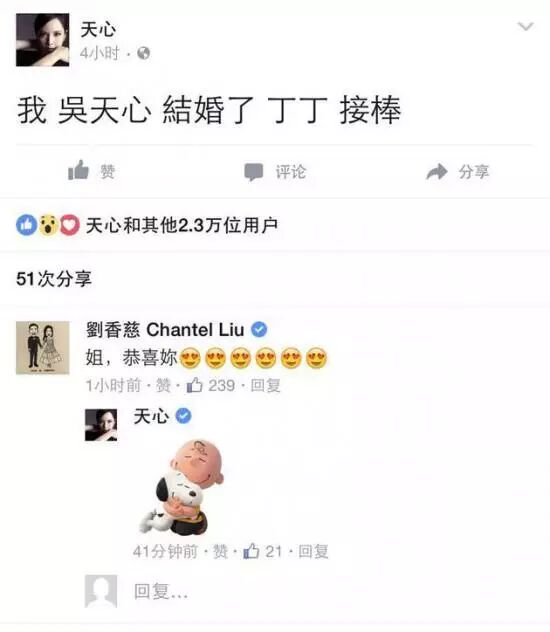 杨千霈在得知好友天心已婚的消息后,第一时间献上祝福,“你不知道妹子有多爱你!多为你开心!多少说不出的感谢你一路陪伴”,盼望与好姊妹今后都能在婚姻这条路上幸福满满。
