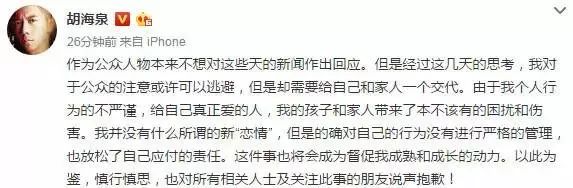 作为公众人物本来不想对这些天的新闻作出回应。但是经过这几天的思考,我对于公众的注意或许可以逃避,但是却需要给自己和家人一个交代。由于我个人行为的不严谨,给自己真正爱的人,我的孩子和家人带来了本不该有的困扰和伤害。我并没有什么所谓的新“恋情”,但是的确对自己的行为没有进行严格的管理,也放松了自己应负的责任。这件事也将会成为督促我成熟和成长的动力。以此为鉴,慎行慎思,也对所有相关人士及关注此事的朋友说声抱歉!
