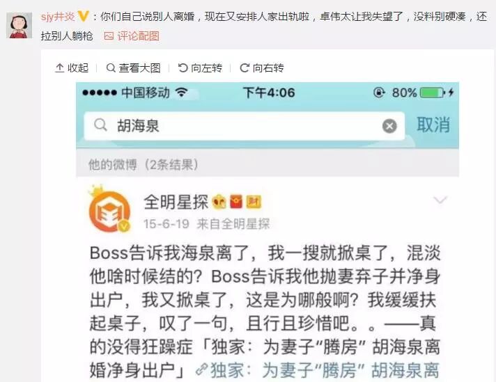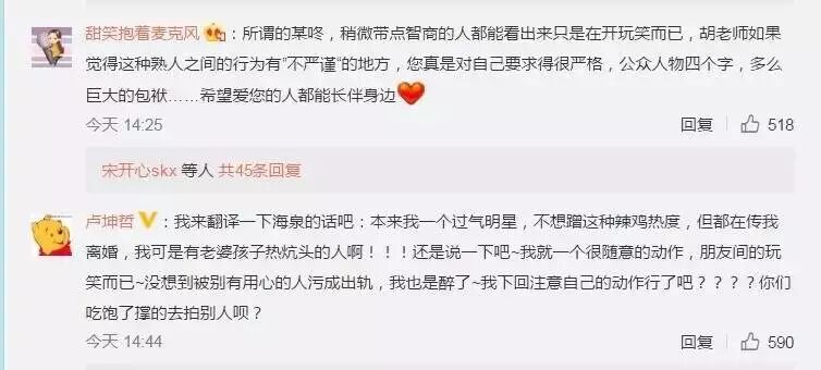 更搞笑的是,海泉微博发声后,被骂得最多的,却不是海泉,而是又一次令网民失望的卓伟,有网友表示:“人家胡海泉不是早就离婚了,这叫出轨吗?”