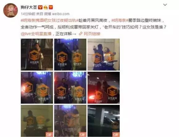 本周周一,卓伟徒弟@狗仔大圣又添一料,全明星直播曝光了胡海泉带女子回家过夜疑似出轨的劲爆消息,一时间令无数网友咋舌。