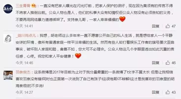 不过与之前的“周一见”事件不同,这一次在胡海泉发发声微博下面,网友的态度以力挺、鼓励偏多。