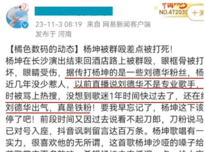 传言称,冲突的起因是杨坤此前曾贬低了刘德华的歌艺专业性,激怒了刘德华的忠实粉丝。然而,这些传言的真实性值得怀疑,尤其是考虑到最近关于刘德华的许多不实传闻。因此,我们不妨对这些传言持怀疑态度,毕竟,过去曾发生过很多关于杨坤的无中生有的狂欢。