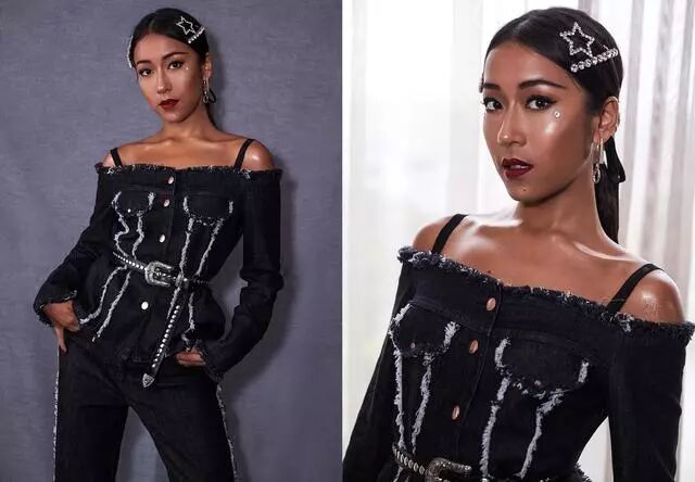 吉克隽逸一直都很敢穿衣,一身黑色牛仔服也能穿的很性感,吊带设计小露香肩也是女人味十足,搭配的妆容更是多了几分酷劲十足的感觉,吉克隽逸虽然皮肤黝黑,但是每一次的妆容都很干净利落,微微上挑的眼线很是妩媚动人。