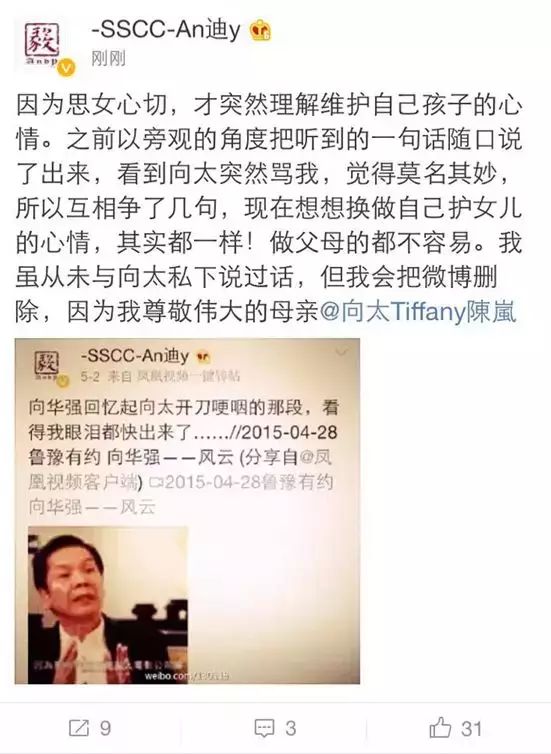 但是硬气不过三天,黄毅清便秒怂,夸赞向太是伟大的母亲。值得注意的是,黄毅清自称之所以怼向华强仅仅是因为别人的一句话,无凭无据便随口说了出来。原来在黄毅清的世界里,言论是真的“自由”。