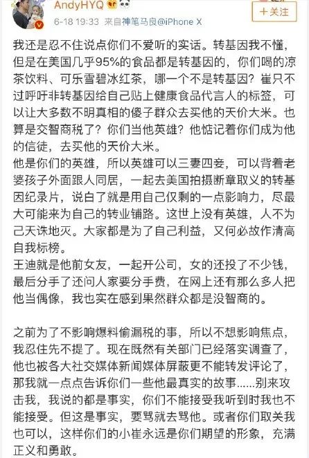 希望大家不要被黄毅清的爆料带跑偏,就事论事,我们支持的是崔永元爆料娱乐圈偷税漏税这个事,支持的不是某个人,而是公平和正义!