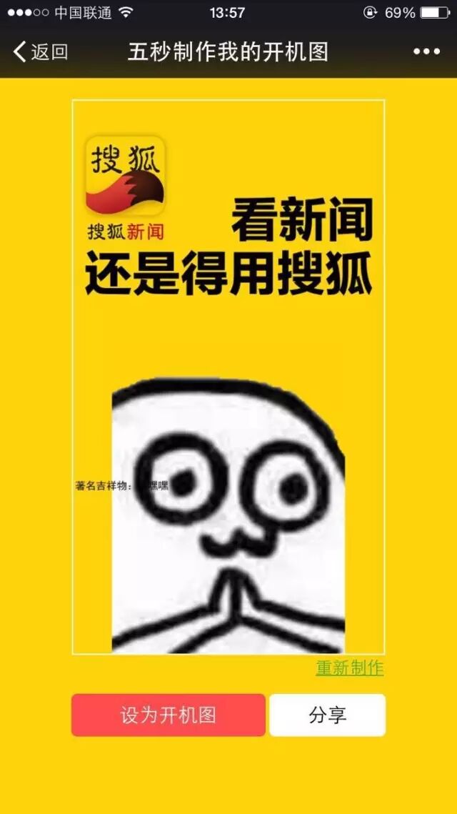 乃们想像一下,如果这个照片儿换成了你,然后你发送了朋友圈儿,就会咣叽一下闪瞎一票人,对不对!而且吼!更碉堡的地方,在于,你还可以登陆搜狐新闻客户端,并且上传照片儿,等你再开机的时候,就会变成你APP的登陆图!你们想像一下!打开一个APP,上面竟然是你自己的照片,即使你是在灰头土脸的挤地铁,也仍然会给人一个低调的“人生赢家”的印象,有米有!