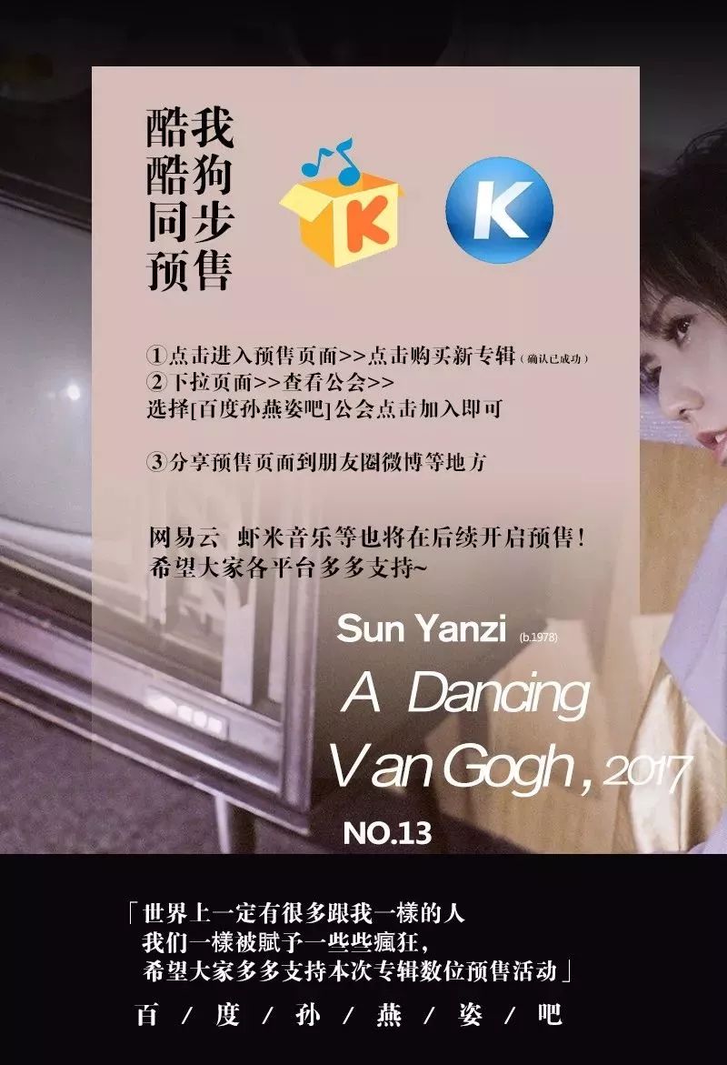 各部门注意! 以为孙燕姿新专辑宣传就这么结束了咩。为感谢姿迷们对@孙燕姿 最新专辑《孙燕姿NO.13作品:跳舞的梵谷》超大力支持,唱片公司Universal Music环球音乐将携手腾讯音乐娱乐集团旗下@QQ音乐 @酷我音乐 @酷狗音乐 共同举办“孙燕姿新歌唱谈会”,邀请姿迷亲临现场与燕姿零距离互动!现场你可以和燕姿畅聊新专辑制作的点滴,分享热门歌曲,趣味互动认识“不一样的孙燕姿”。心动不做为新专辑歌曲的全球首唱,本次活动不公开售票,将采取线上抽票的形式回馈一直以来大力支持燕姿的乐迷粉丝朋友!具体细则将于近期在腾讯音乐娱乐集团及@环球音乐华语 公布[噢耶]密切关注,走过路过不容错过!