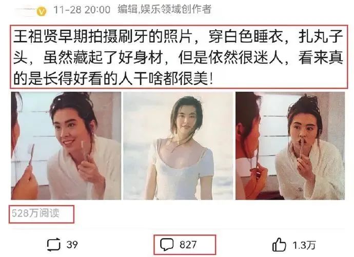 真正的明星是从来都不会缺少关注度的,王祖贤就是典型的例子,11月28日,有一位娱乐博主在网上晒出了一组王祖贤刷牙的照片,并配文“王祖贤早期拍摄刷牙的照片,穿白色睡衣,扎丸子头,虽然藏起了好身材,但是依然很迷人,看来真的是长得好看的人干啥都很美!”不到2个小时,这一组王祖贤刷牙照片的浏览量就超过了500万次,网友评论数高达827条。