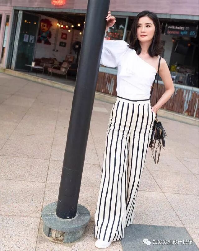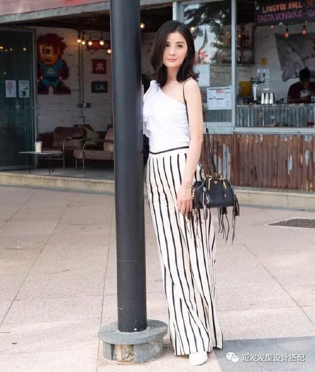 蔡卓妍的腿稍微粗一点,因此她穿了一件白色的条纹阔腿裤,阔腿裤很好的遮住了她的肉肉,不过大腿这好像有点紧了,上身是一件白色的斜肩上衣,一半有袖一半没袖的设计相当的时髦,彰显了蔡卓妍的魅力!整体上看这样穿还拉长了她的身材呢~