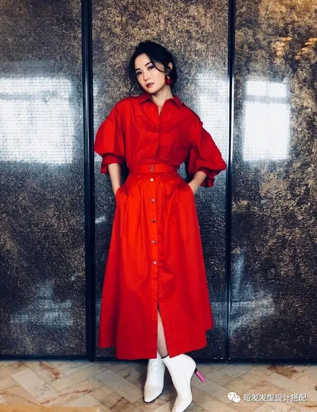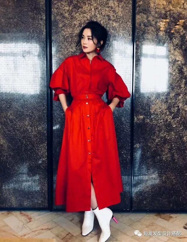 蔡卓妍穿红色还是挺迷人的嘛!一件红色的衬衫裙不仅凸显的她的气质,而且还非常的优雅动人,红色非常显高贵的气质,前面一排扣子正好拉长了身线,显得身材十分的高挑,红色大耳环的点缀,与这件衬衫裙交相呼应,很是时髦~