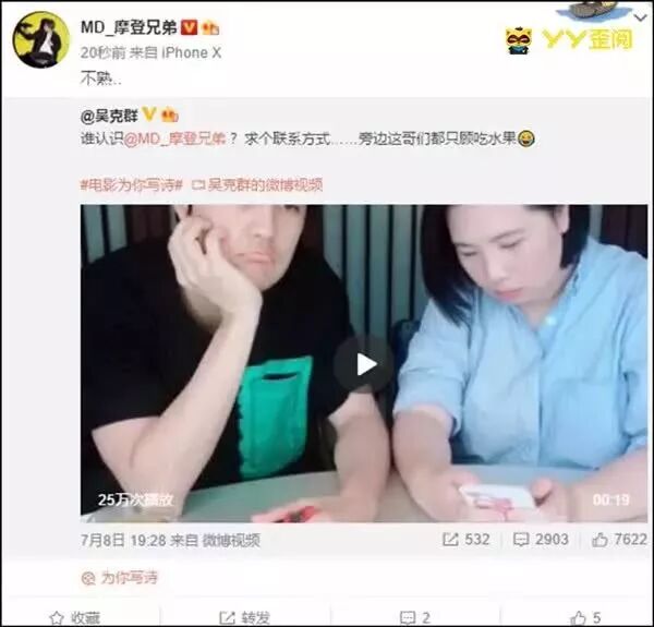 不过当点开视频后,粉丝看到摩登兄弟在视频中的表现,爆笑不已。吴克群竟然是想找摩登兄弟为自己的新电影演唱主题曲,而摩登兄弟也在吴克群的身旁,当然俩人拍视频是为了搞笑效果,看来摩登兄弟已经与吴克群达成了合作,为吴克群演唱电影主题曲了,期待啊。