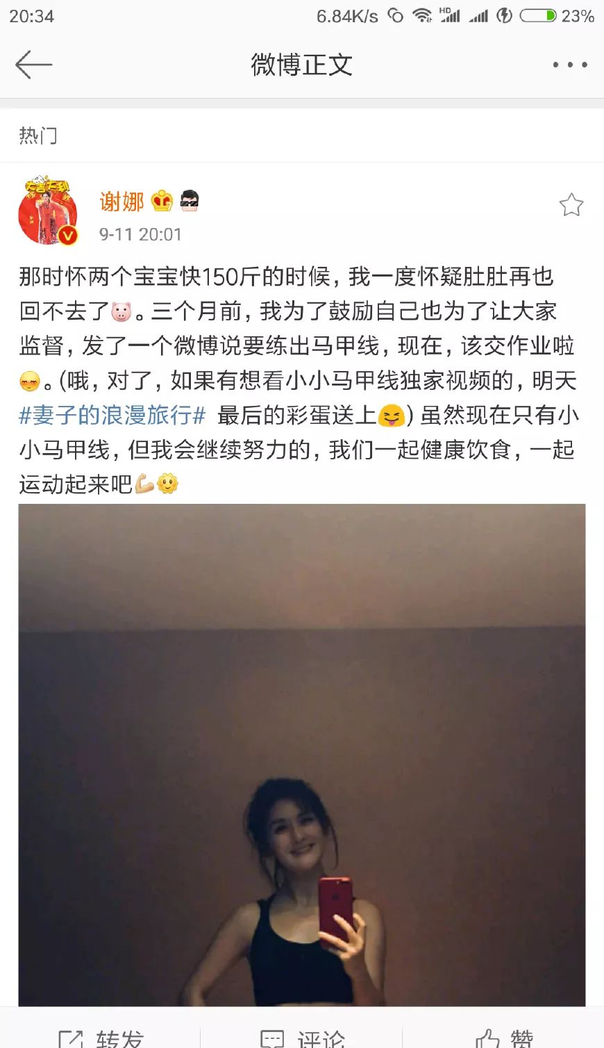 谢娜晒马甲线,3个月前承诺实现
