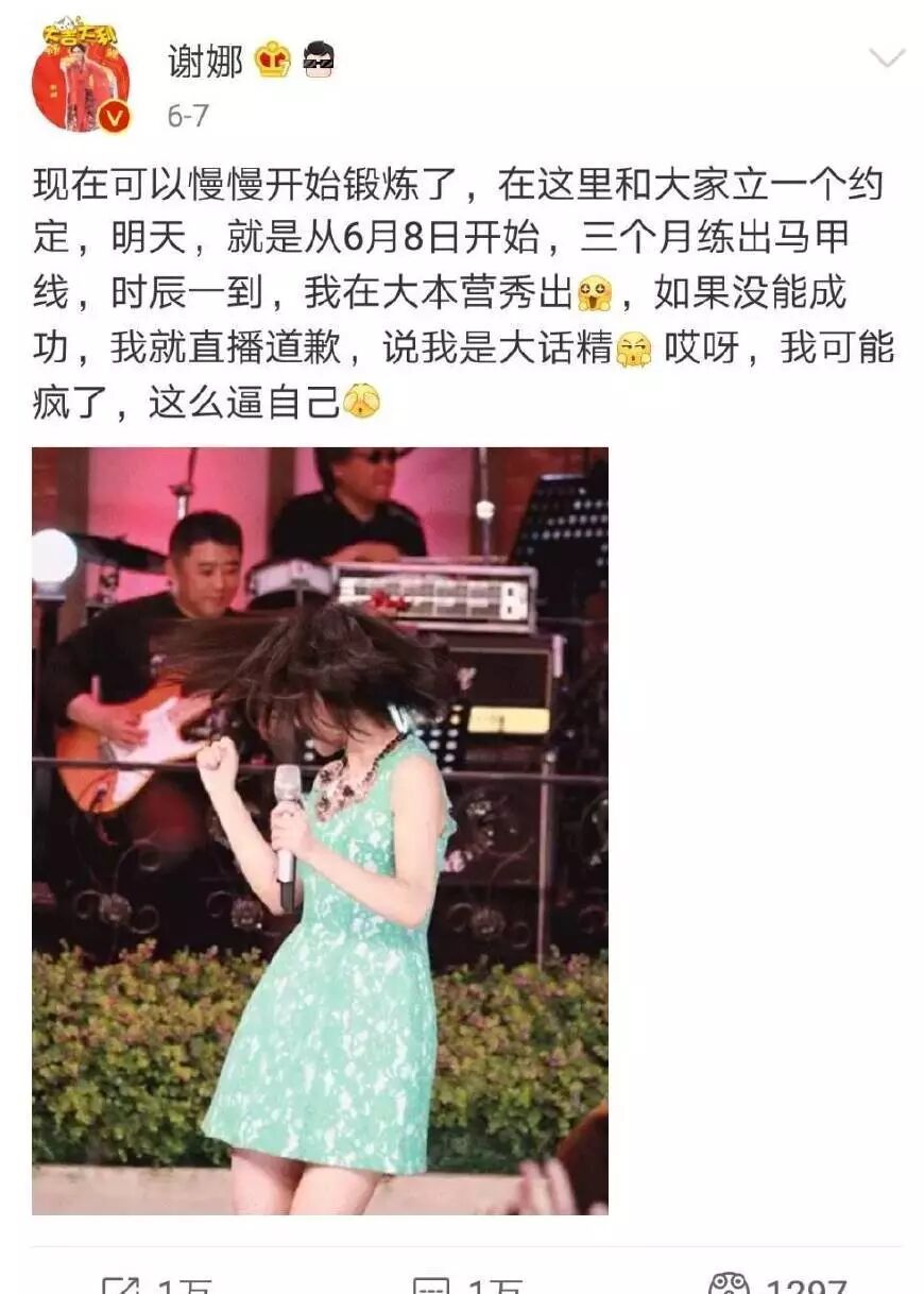 为了能成功减肥,六月份的时候,她曾发了这样一条微博。在微博上,她为了让网友一起督促她减肥,配文称自己要从6月8号起的三个月时间里,成功练出马甲线。要是没有成功,她就是个大话精。谢娜这样逼自己,想必自己本身也是非常有毅力了。当看到谢娜这样说的时候,很多粉丝都为娜娜捏了把汗。要知道,就算是没有怀孕的年轻人练出马甲线也不是什么简单的事情。而谢娜刚生完孩子,体重涨了这么多,在练出马甲线之前还要把自己的体重减下来,可以说是真的非常有压力了。