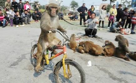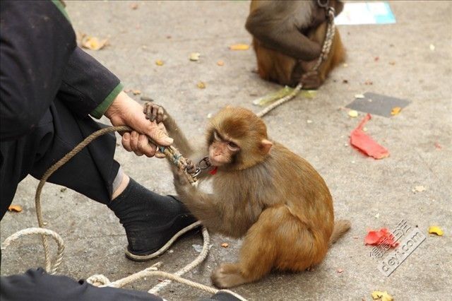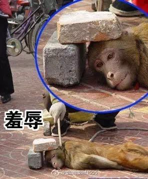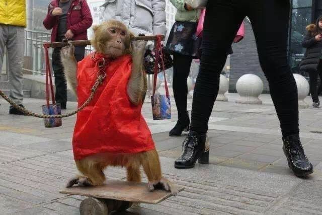 马戏中的猕猴,它们被一根没有弹性的绳子拴着,当主人拿着鞭子抽打时,它们只能在原地画圈一样逃跑,惨烈地叫着。