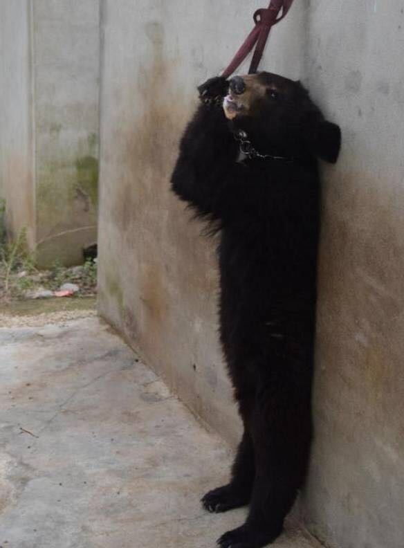 为了让黑熊学会站立鞠躬,被强迫用后腿直立,方法是用铁链拴住脖子,挂在墙边,只要它试图用前腿着地,就会被勒窒息。