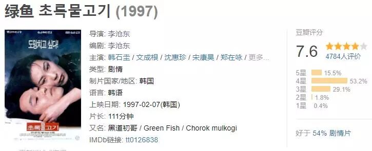 《绿鱼》是李沧东“绿色系列”的第一部,连同《薄荷糖》、《绿洲》,李沧东确立了他在本土的地位,同时在国际电影节也打开了知名度。《绿鱼》跟李沧东的关系如同《小武》之于贾樟柯,同为第一部剧情长片,先后获得温哥华国际电影节的龙虎奖。《绿鱼》的入口可以把它视为韩国式帮派片,不过走的是李沧东个人特色的写实路线。李沧东想要表现的主题是借助类型化的帮派片关注韩国社会的变化,就如同台湾等其他东亚国家地区的电影讲过的:古老传统的生活方式、祖辈相传的价值观念遭到了破坏,功利主义盛行的社会卑劣不堪。身处这个熔炉中的渺小个体,无可避免地受到社会的牵连影响,《绿鱼》主人公莫东就是其中之一。