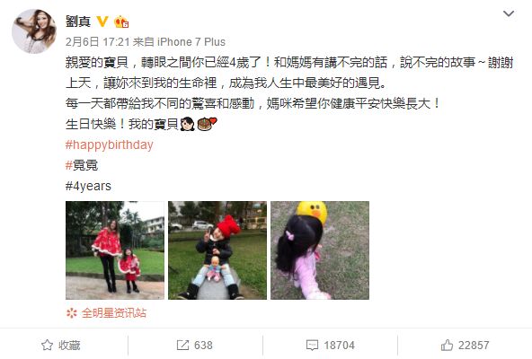 2月6日,刘真在微博晒出了与女儿的合影为她庆祝4岁的生日:“谢谢上天,让你来到我的生命里,成为我人生中最美好的遇见。”这也是她的最后一条微博。
