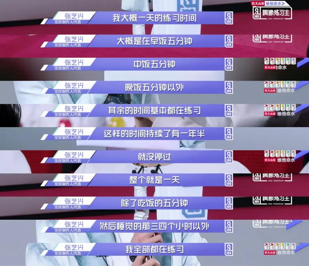 在《偶像练习生》中讲述自己的练习生生活,“每天只睡三四小时,全部时间都在练习”
