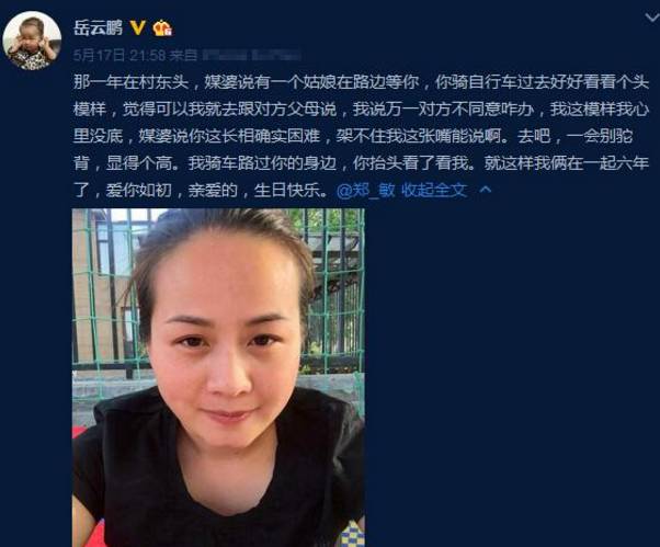 在岳云鹏的博文中,分享了两人认识的全过程:“那一年在村东头,媒婆说有一个姑娘在路边等你,你骑自行车过去好好看看个头模样,觉得可以我就去跟对方父母说,我说万一对方不同意咋办,我这模样我心里没底,媒婆说你这长相确实困难,架不住我这张嘴能说啊。去吧,一会别驼背,显得个高。我骑车路过你的身边,你抬头看了看我。就这样我俩在一起六年了,爱你如初,亲爱的,生日快乐。”
