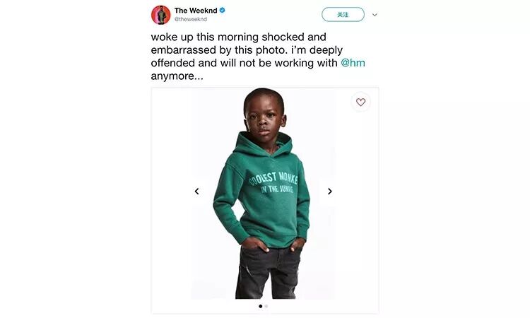 “今早醒来看到这张照片,既震惊又耻辱,我深感被冒犯了,并且将会停止与 H&M 的合作…”。作为一个与 H&M 推出过好几次合作系列的歌手,The Weeknd 凭借着自己的人气与这个快时尚品牌加入到了 Fan Merch 大军当中,去年 9 月,双方才刚刚展开了进一步合作,推出独家精选系列 (Selected by The Weeknd),这下可好,钱可能还没赚够,“金主”就被气跑了,而且今后 H&M 可能也很难再找到这样的明星进行合作了,起码…黑人明星是别想了。