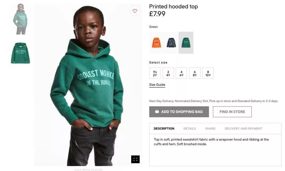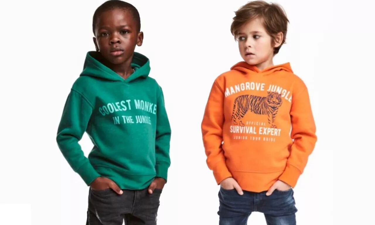 乍一看挺正常的,但写着 “COOLEST MONKEY IN THE JUNGLE(丛林中最酷的猴子)” 标语的帽衫加上黑人小模特的设定,问题一下就显现出来了…要知道,“猴子”这一称呼在西方世界可是一种流传甚广的对黑人种族的侮辱,带有这样标语的一件帽衫交给一个黑人小孩来演绎,的确很容易会让人感到不舒服,不过,H&M 当然也可以辩解称这只是个巧合,但…在有着强烈对比的情况下,就不会这么容易了事了: