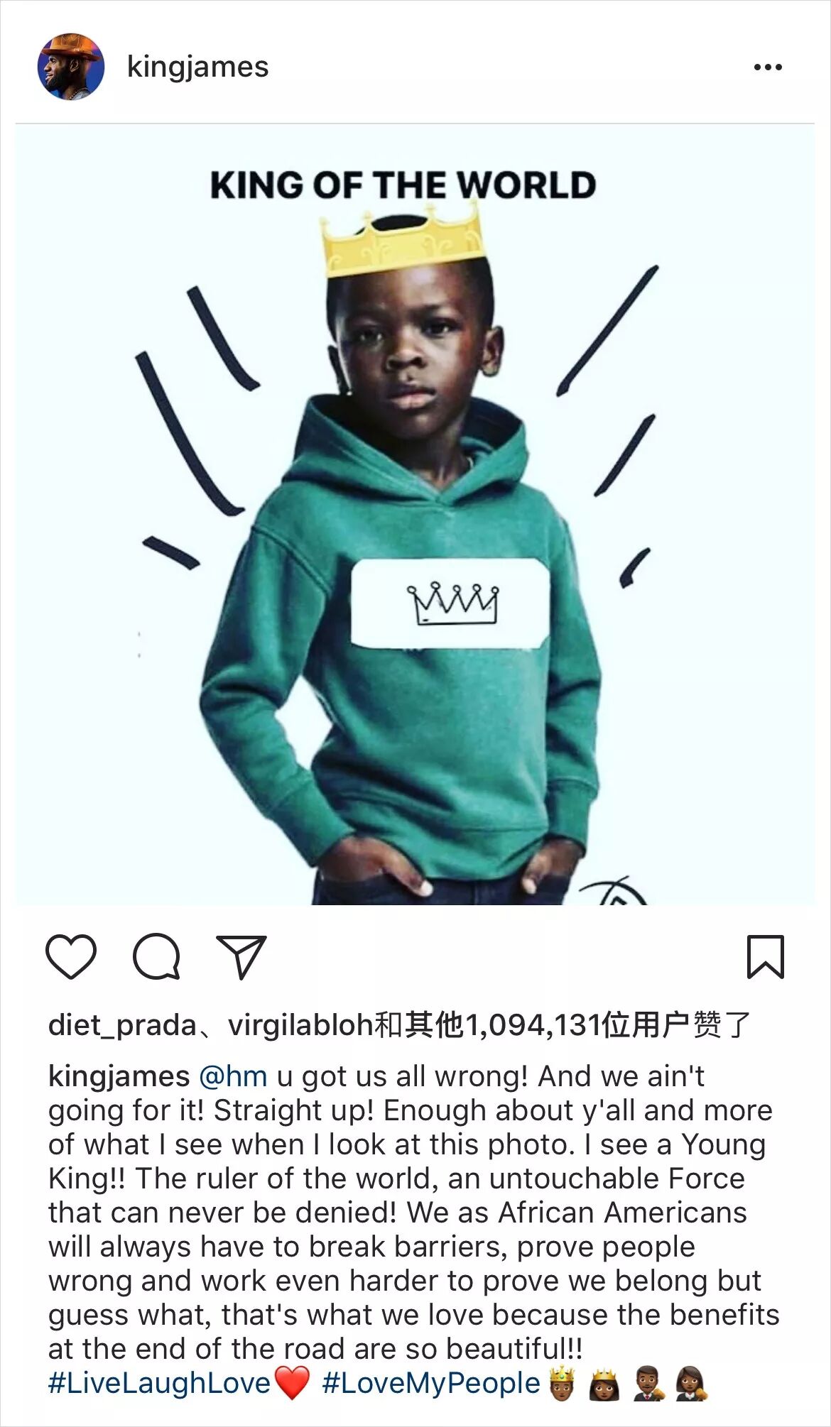 卢卡库在自己的 Instagram 中写道:“你是一位王子,即将成为君王。别让任何人说你不一样”,而有着 3,000 多万粉丝的詹姆斯则更加用心,除了为广告中的黑人小孩“戴”上了皇冠之外,还发表了一段鼓舞人心的正能量言论,短短两天之内,这条 Instagram 已经得到了超过 1 百万的赞。